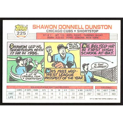 This is a 1988 Topps Big Shawon Dunston baseball card. The card is #225 and pictures show condition.
