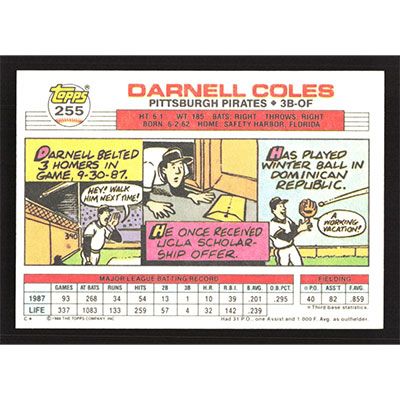 This is a 1988 Topps Big Darnell Coles baseball card. The card is #255 and pictures show condition.