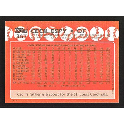 This is a 1988 Topps Traded Cecil Espy baseball card. The card is #36T and pictures show condition.