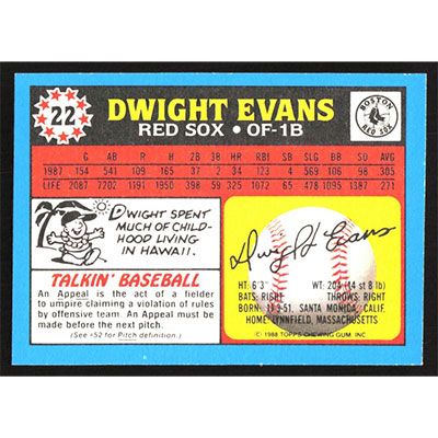 This is a 1988 Topps UK Minis Dwight Evans baseball card. The card is #22 and pictures show condition.