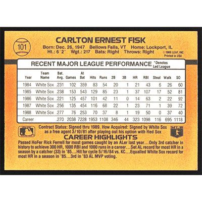 This is a 1989 Donruss Carlton Fisk baseball card. The card is #101 and pictures show condition.