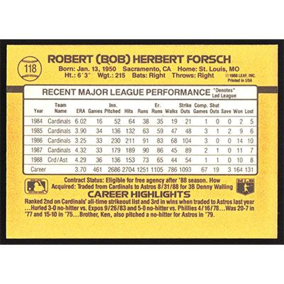 This is a 1989 Donruss Bob Forsch baseball card. The card is #118 and pictures show condition.