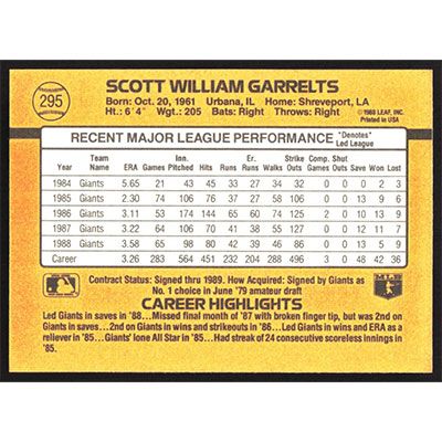 This is a 1989 Donruss Scott Garrelts baseball card. The card is #295 and pictures show condition.