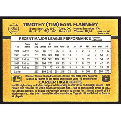 This is a 1989 Donruss Tim Flannery baseball card. The card is #364 and pictures show condition.