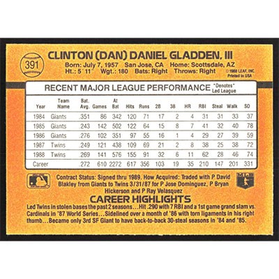This is a 1989 Donruss Dan Gladden baseball card. The card is #391 and pictures show condition.