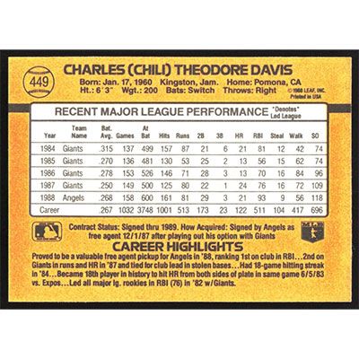 This is a 1989 Donruss Chili Davis baseball card. The card is #449 and pictures show condition.