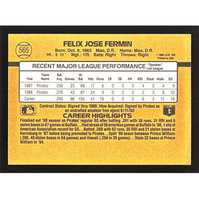 This is a 1989 Donruss Felix Fermin baseball card. The card is #565 and pictures show condition.