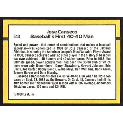 This is a 1989 Donruss Jose Canseco 40/40 Club baseball card. The card is #643 and pictures show condition.