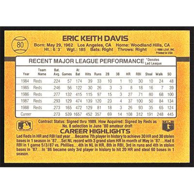 This is a 1989 Donruss Eric Davis baseball card. The card is #80 and pictures show condition.