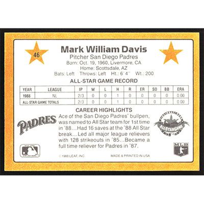 This is a 1989 Donruss All-Stars Mark Davis baseball card. The card is #46 and pictures show condition.