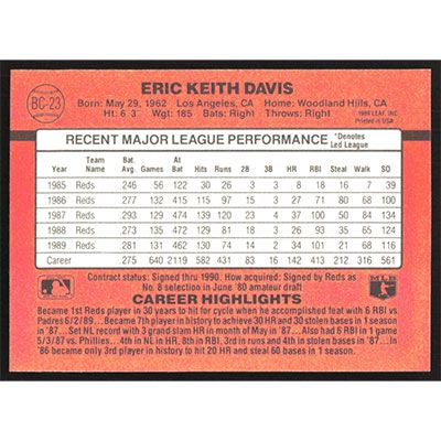 This is a 1989 Donruss Bonus MVPs Eric Davis baseball card. The card is #BC-23 and pictures show condition.