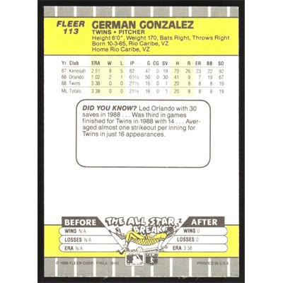 This is a 1989 Fleer German Gonzalez baseball card. The card is #113 and pictures show condition.