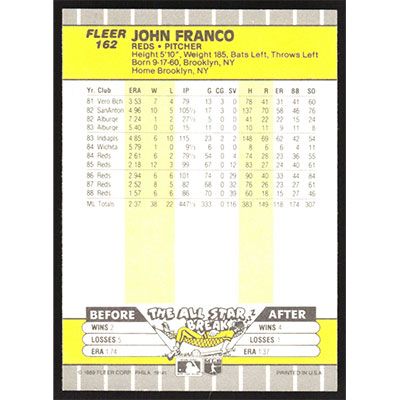This is a 1989 Fleer John Franco baseball card. The card is #162 and pictures show condition.