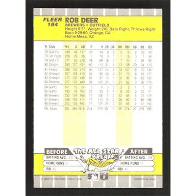 This is a 1989 Fleer Rob Deer baseball card. The card is #184 and pictures show condition.