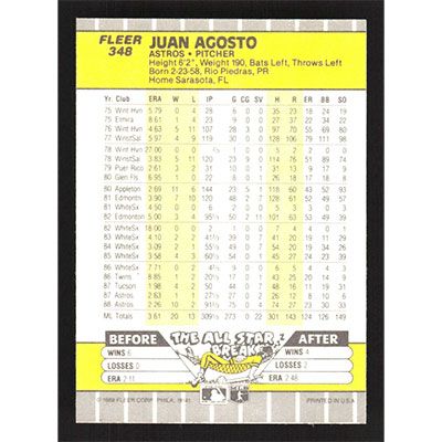 This is a 1989 Fleer Juan Agosto baseball card. The card is #348 and pictures show condition.