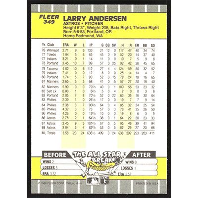 This is a 1989 Fleer Larry Andersen baseball card. The card is #349 and pictures show condition.