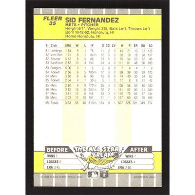 This is a 1989 Fleer Sid Fernandez baseball card. The card is #35 and pictures show condition.