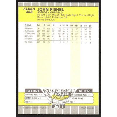This is a 1989 Fleer John Fishel baseball card. The card is #358 and pictures show condition.