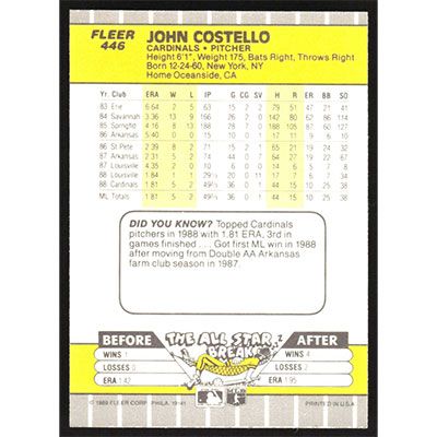 This is a 1989 Fleer John Costello baseball card. The card is #446 and pictures show condition.
