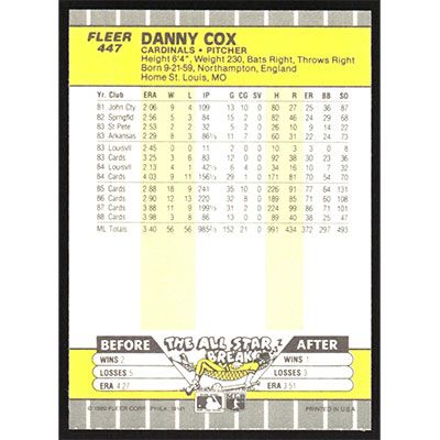 This is a 1989 Fleer Danny Cox baseball card. The card is #447 and pictures show condition.