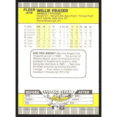 This is a 1989 Fleer Willie Fraser baseball card. The card is #478 and pictures show condition.