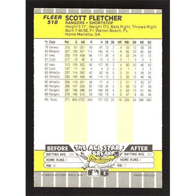 This is a 1989 Fleer Scott Fletcher baseball card. The card is #518 and pictures show condition.