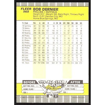 This is a 1989 Fleer Bob Dernier baseball card. The card is #565 and pictures show condition.