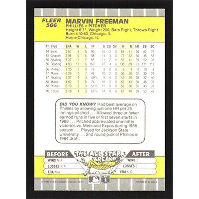 This is a 1989 Fleer Marvin Freeman autographed baseball card. This card has been signed, in blue, by Marvin Freeman, and is guaranteed authentic by Ballcardz.com. The card is #566 and pictures show condition.