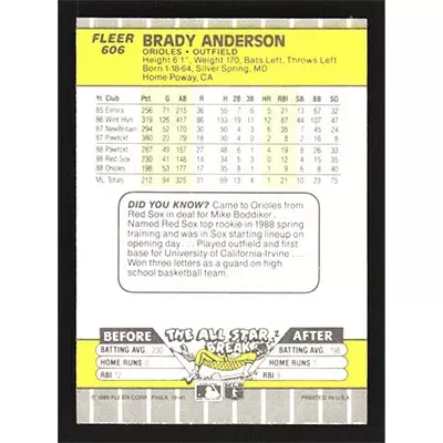 This is a 1989 Fleer Brady Anderson baseball card. The card is #606 and pictures show condition.