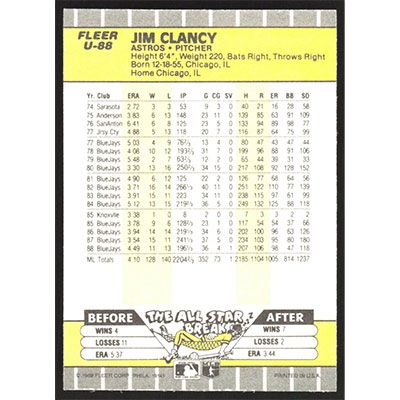 This is a 1989 Fleer Update Jim Clancy baseball card. The card is #U-88 and pictures show condition.
