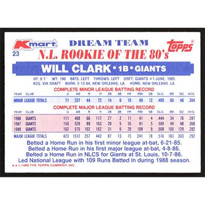 This is a 1989 K-Mart Will Clark baseball card. The card is #23 and pictures show condition.
