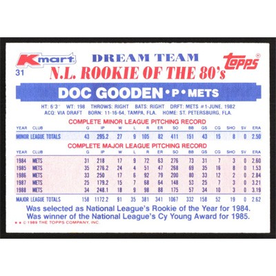 This is a 1989 K-Mart Doc Gooden baseball card. The card is #31 and pictures show condition.