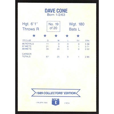 This is a 1989 Nissen Dave Cone baseball card. The card is #19 and pictures show condition.