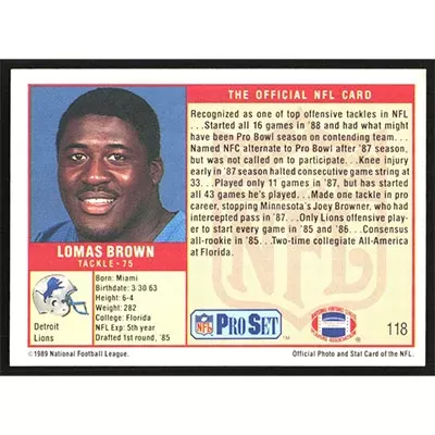 This is a 1989 Pro Set Lomas Brown football card. The card is #118 and pictures show condition.