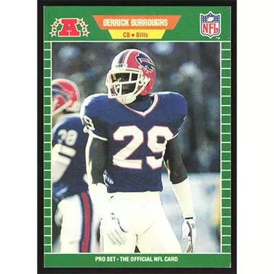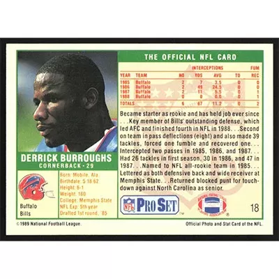 This is a 1989 Pro Set Derrick Burroughs football card. The card is #18 and pictures show condition.