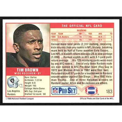 This is a 1989 Pro Set Tim Brown football card. The card is #183 and pictures show condition.