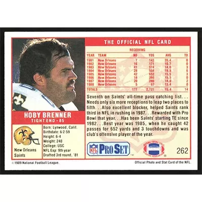 This is a 1989 Pro Set Hoby Brenner football card. The card is #262 and pictures show condition.