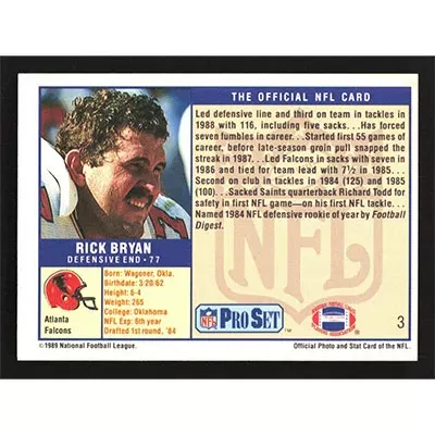 This is a 1989 Pro Set Rick Bryan football card. The card is #3 and pictures show condition.