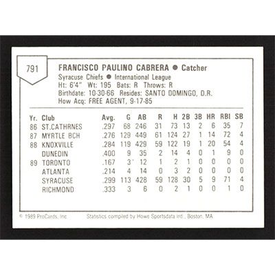 This is a 1989 ProCards Francisco Cabrera autographed baseball card. This card has been signed, in blue, by Francisco Cabrera, and is guaranteed authentic by Ballcardz.com. The card is #791 and pictures show condition.