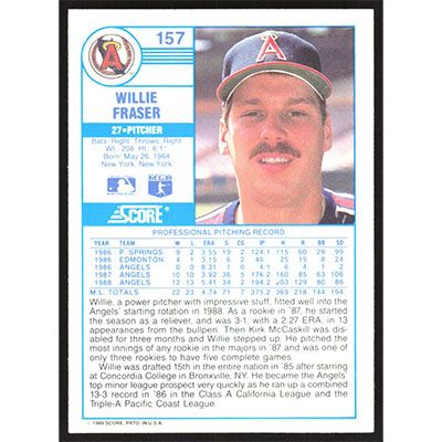 This is a 1989 Score Willie Fraser baseball card. The card is #157 and pictures show condition.