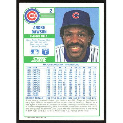 This is a 1989 Score Andre Dawson baseball card. The card is #2 and pictures show condition.