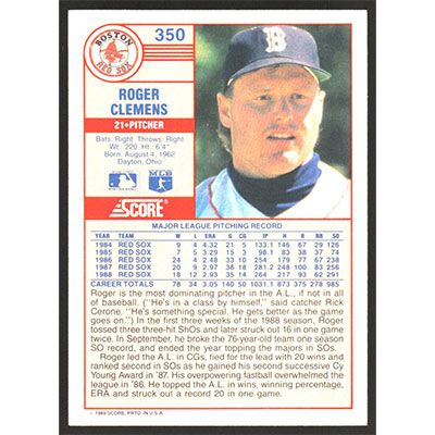 This is a 1989 Score Roger Clemens baseball card. The card is #350 and pictures show condition.