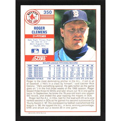 This is a 1989 Score Roger Clemens Error - 778 Wins baseball card. The card is #350 and pictures show condition.