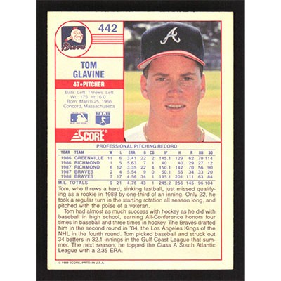 This is a 1989 Score Tom Glavine autographed baseball card. This card has been signed, in black, by Tom Glavine, and is guaranteed authentic by Ballcardz.com. The card is #442 and pictures show condition.