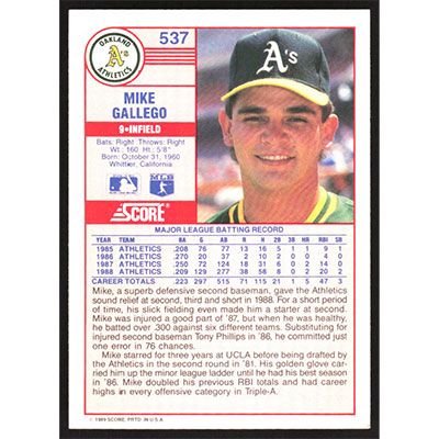 This is a 1989 Score Mike Gallego baseball card. The card is #537 and pictures show condition.