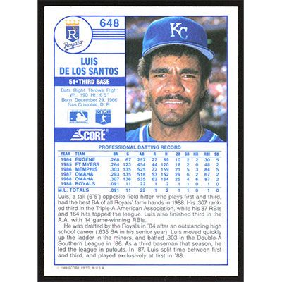 This is a 1989 Score Luis De Los Santos baseball card. The card is #648 and pictures show condition.