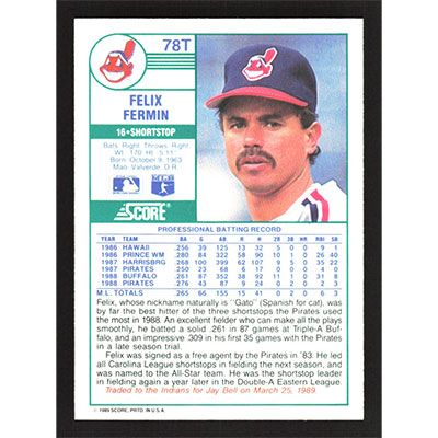 This is a 1989 Score Rookie/Traded Felix Fermin baseball card. The card is #78T and pictures show condition.