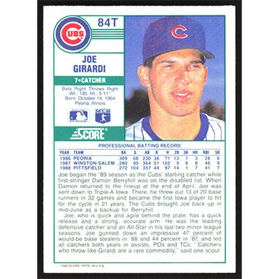 This is a 1989 Score Rookie/Traded Joe Girardi baseball card. The card is #84T and pictures show condition.