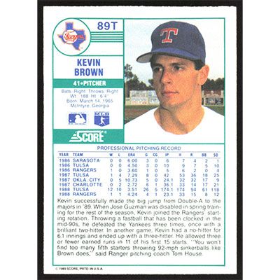 This is a 1989 Score Rookie/Traded Kevin Brown baseball card. The card is #89T and pictures show condition.