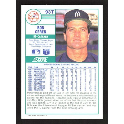 This is a 1989 Score Rookie/Traded Bob Geren baseball card. The card is #93T and pictures show condition. Team(s): New York Yankees Rookie Card (RC)